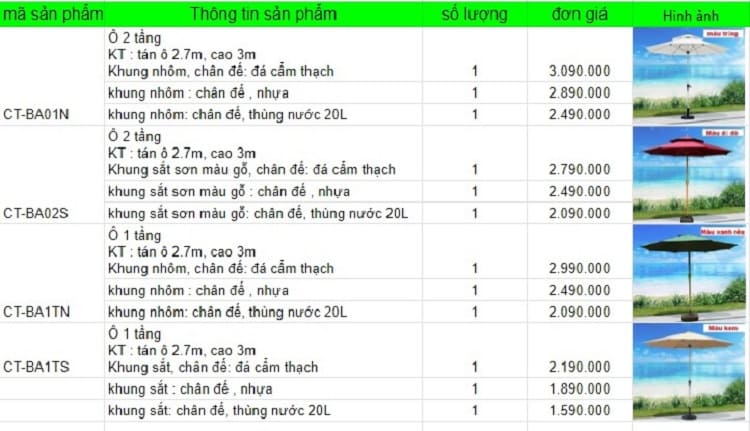 Bảng giá các loại ô dù ngoài trời chính tâm
