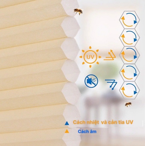 – Cách nhiệt tốt vào mùa hè và giữ ấm vào mùa đông. Rèm cuốn tổ ong có khe hở ở giữa, bên trong lõi rèm cuốn được phủ thêm một lớp phim bạc, giúp chống nắng tuyệt đối và điều tiết nhiệt độ tốt. Vào mùa hè chống nắng và cách nhiệt, vào mùa đông rèm tổ ong giữ ấm cho căn phòng.
